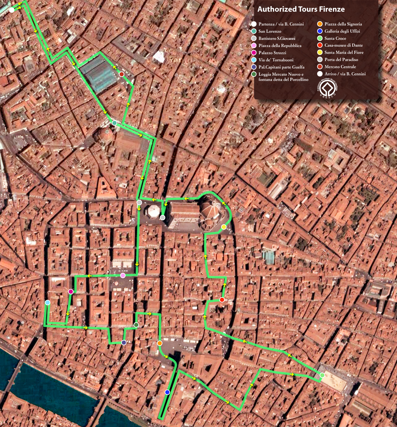 Dopo aver preso confidenza con il proprio mezzo Segway PT al Garage Giglio 1-Via del Giglio 24/R -GPS 43°46'28.4"N 11°15'07.8"E-, si giunge a San Lorenzo e poi al Battistero di San Giovanni, con le sue celebri porte in bronzo dorato.