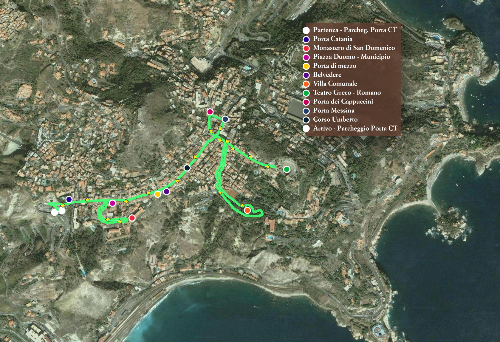 Il nostro punto d’incontro per iniziare la visita di questa città sarà la terrazza sopra il "Parcheggio Porta Catania” -GPS 37°51'02.8"N 15°16'48.4"E- (non “Arco di Porta Catania”), vicino alla biglietteria del parcheggio.