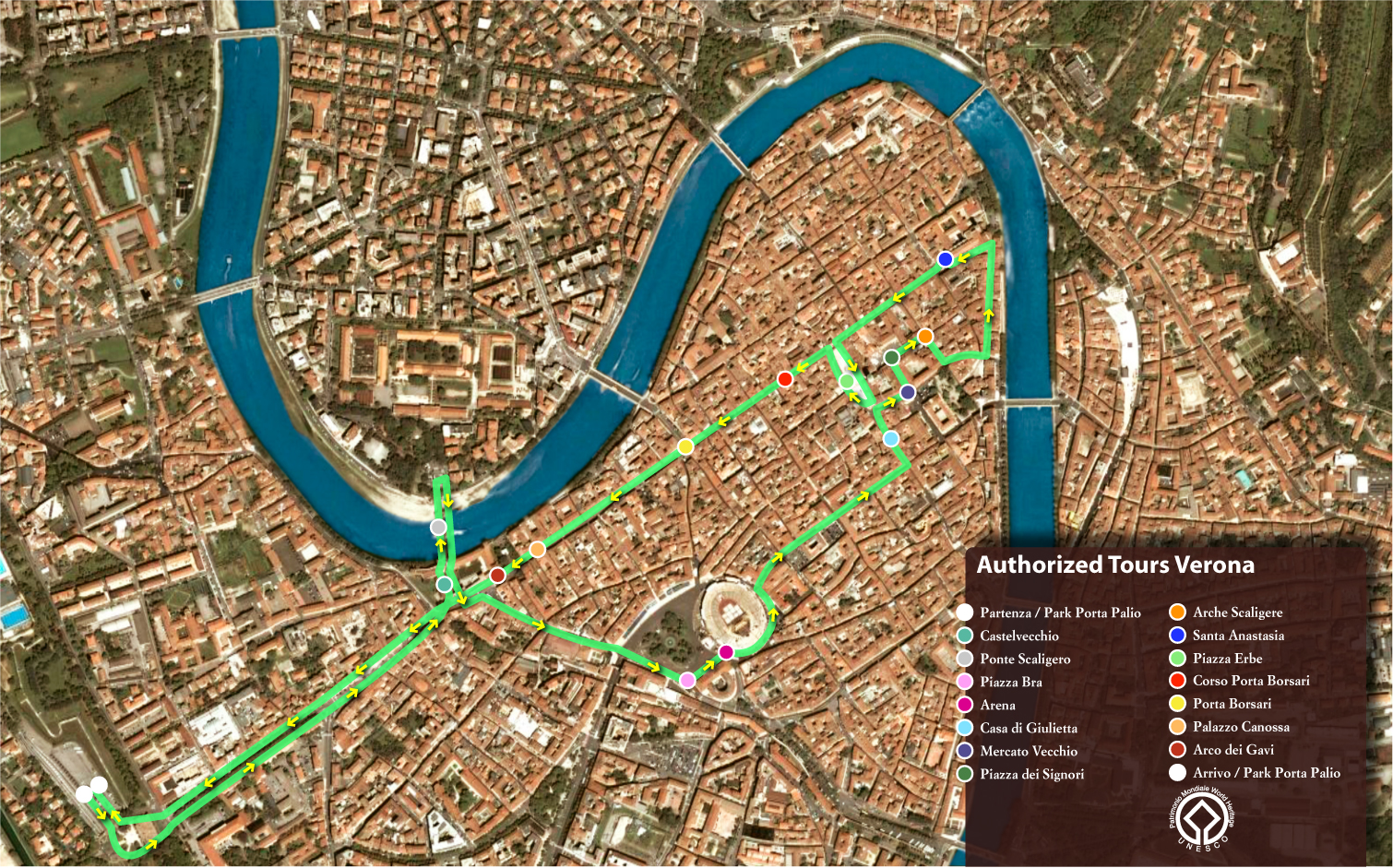 Il tour inizia da Via Luigi da Porto, 3 -GPS 45°26'05.7"N 10°59'50.1"E- vicino via del Pontiere, dove impareremo ad usare il nostro mezzo di trasporto.